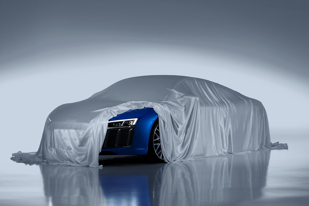 第二代R8最初的曝光,要算是2月中旬,Audi透露新一代R8將會提供雷射頭燈作為選配,而將其頭燈與前氣壩設計先行展露於世人眼前開始。當時,布幔下的輪廓,也依稀可見新一代R8的大致線條,有著與第一代R8相仿的外觀比例,但六角形的水箱護罩變得更為突出,同時取法新一代TT的晝行燈造型,以兩道鋒利垂直晝行燈貫穿其中,並與下方氣壩的導流板相互連結。