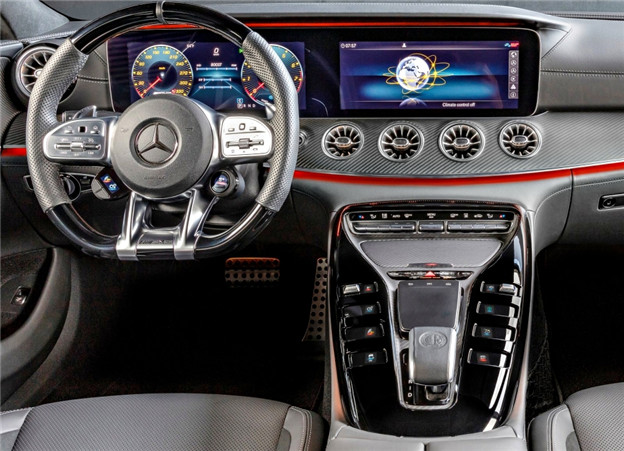 內裝配置也維持既有架構,有著 AMG GT 精隨的高聳中央鞍座,以「V8」將按鈕介面排列,創造專屬於 GT 4-Door 的性能印象,不過在 GT53、GT63 提供五座、獨立四座兩種設定的情況下,原廠並未表示定位為入門車型的 GT43 是否也能夠擁有此一選配。