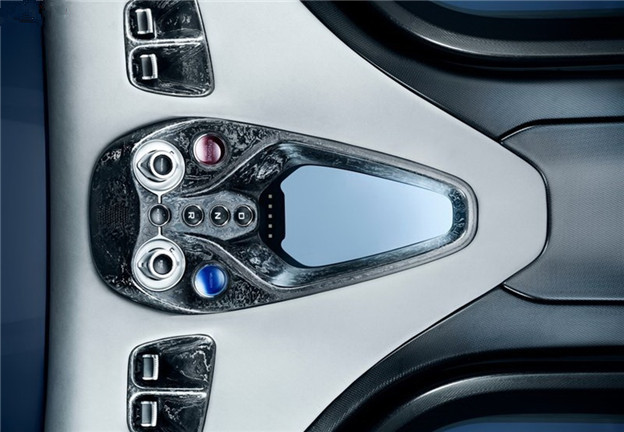 按鍵式排檔設立於車頂,飾板拜鈦沉積碳纖維技術所賜,增添些許奢華感受。