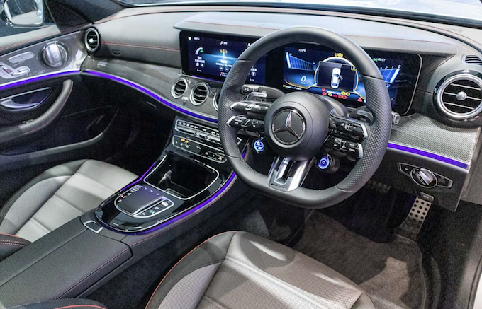 和普通版本E-Class相比,經過重新設計的車頭和AMG 專用鬼面罩,進一步增強AMG 系列特色,車廂內亦經過全面升級:寬屏駕駛艙、全新AMG Performance 軚盤,還有附帶AMG 專用功能和顯示屏的MBUX 資訊娛樂系統,