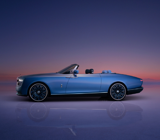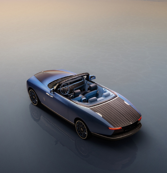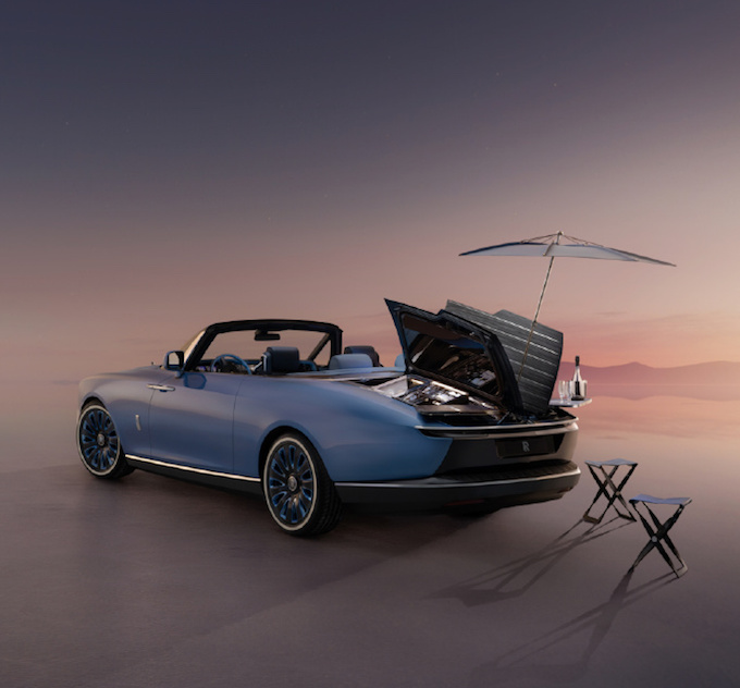 鬼面罩依然採用勞斯萊斯經典的「帕特農神廟」設計,但頭燈更加扁平和細長的尾燈相互輝映。車尾展示了最好的手工設計和尖端的工程技術。因為在傳統後備廂的位置,勞斯萊斯為其定制了類似於遊艇甲板般的待客區。「甲板」由灰黑色開孔Caleidolengo飾板製成,中間還設計了一把可折疊的專屬太陽傘,甚至在「甲板」下層還準備了兩張由勞斯萊斯設計、意大利傢具品牌Promemoria精心打造的雞尾酒凳。在內部,則是為用戶打造的一整套戶外用餐的餐具,以及可以在6攝氏度下快速冷藏的香檳冰箱。